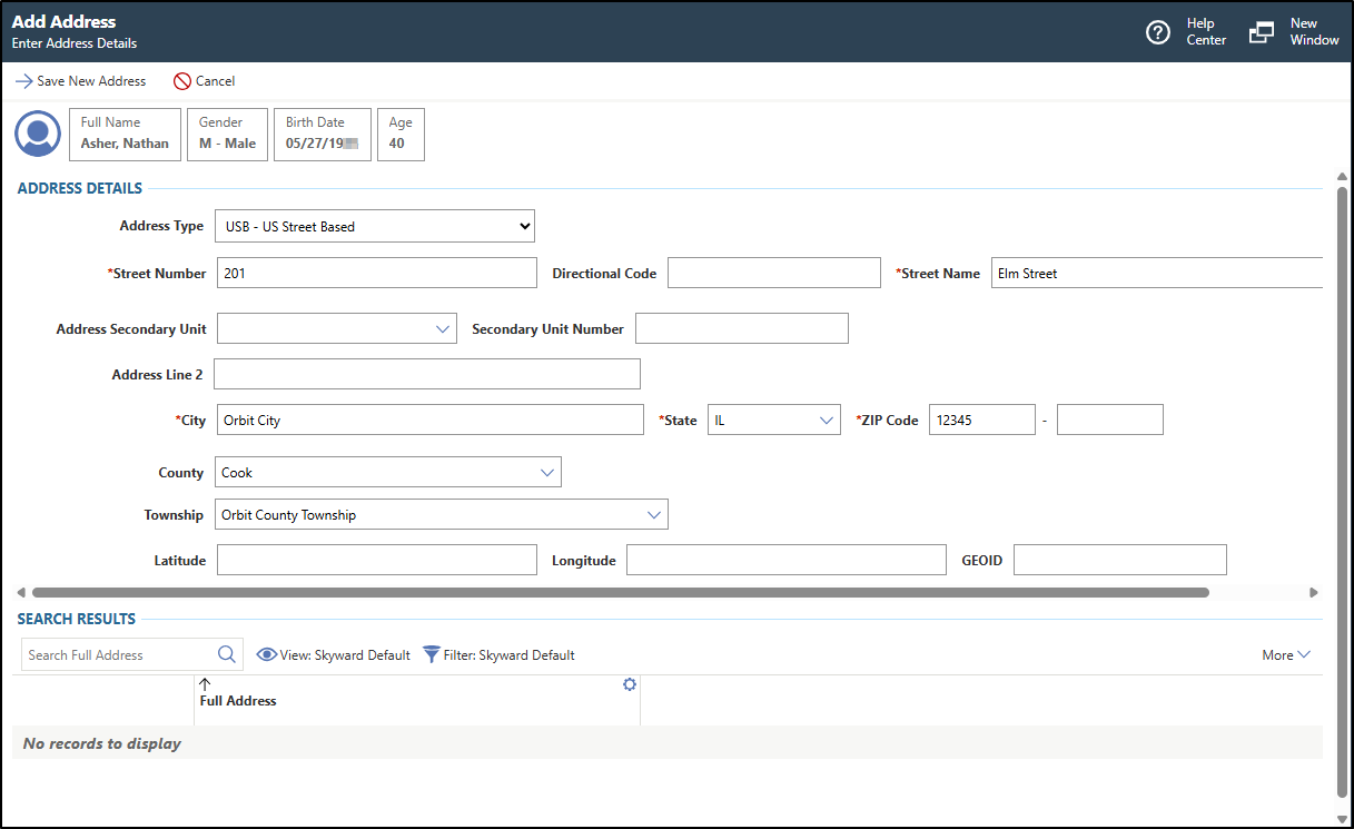 Separating parents or guardians from a student's family record enables you to create two families and update mailing address information. This is helpful for a variety of reasons, such as when guardians of a family divorce. Let's begin the process by navigating to the Student Profile within the Student module. After verifying that we're in the correct student profile, we'll select the Family sub-tab within the Family tab group. Under the Family 1 Guardians heading, we'll click on the drop-down icon next to the guardian we're separating and select the Split from Family/Create New Family option. The Home Language field defaults in based on the home language that was selected for the original family. We can update this field now if it's no longer accurate for this specific guardian. Next, we can enter or verify this guardian's driver's license number if needed. Under the Students Assigned to Original Family heading, we can determine whether we'd like to assign the student to the new family by checking or unchecking the corresponding box. We can also determine whether we'd like this guardian and family to be the student's primary family by checking the Make 1st Family box. For this example, we'll leave this unchecked since the student will continue to live with the primary guardian that is not being removed. The Relationship field can be updated if this guardian's relationship with the student has changed. Scrolling over, we have the options to check or uncheck the boxes for Physical Placement, Legal Decisions, Allow Student Pickup, Emergency Contact, Receives Forms, and Allow Family Access. These boxes default based on the values attached to the guardian in the original family record. This guardian will still have access to the same options as before, so we'll leave all these options as they are. The Age, Default Entity, and Active options default and cannot be changed. After making our revisions, we can click Save & Update Address to update this guardian's address. We're taken to the Name Profile for this guardian. Let's select Add Address since this guardian will have a new permanent residence. We'll need to enter in all of the address details now. The Address Type field defaults to USB - US Street Based but can be updated if we're creating an address that is not US Street Based. We'll then need to enter the Street Number for the new address. This address has a Directional Code of East. Let's enter the new street name for the new address. We can then enter information into the Address Secondary Unit and Secondary Unit Number fields if necessary. Since this address has no secondary address information, we'll leave them blank. The Address Line 2 field can be used to include additional information for this address if applicable. Next, we need to identify the city, state, and ZIP code for this address. We have the option to specify the county and township this address is located in if we'd like. For our example, this address is located within Orbit Creek Township of Cook County. Latitude and longitude information can be entered if we'd like to keep track of the degree measurements of the address's distance from the equator and prime meridian. The GEOID indicates the location of an address through the use of a 12-digit ID number assigned by the United States Census Bureau. This value is a combination of numbers in a set order which includes the two-digit state number, three-digit county number, six-digit census tract number, and a one-digit block group number. If we'd like to keep track of this information as well, we can enter that in now. If this address already exists within our system, we'll see it display under the Search Results heading. For this example, we'll select Save New Address to continue. Since this guardian currently has two addresses attached, we need to identify the address details by checking the boxes that we'd like to enable. For this example, we'll check the Select box to include all the options. A warning message now displays stating that this guardian's old address is not flagged for use and will be removed. Since this is correct, we'll click Save again to confirm these changes. Under the Addresses heading, we'll see the new address we just created listed here. Because we want to see the changes we made to this student's family information, we'll navigate back to the Student Profile within the Student module. Back on the Family sub-tab of the Family tab group, we'll scroll down to see that there are now two separate families attached to this student's profile. After successfully separating guardians from a student's family record, you can ensure that each guardian's address is correct along with their access to the student's information.