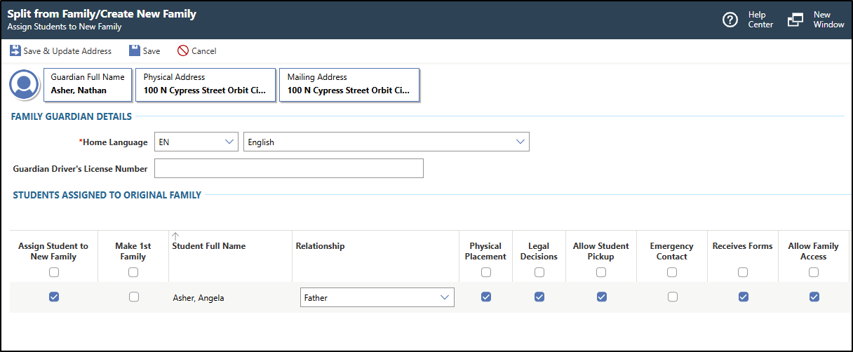 Users, such as school administrators, may need to separate a student's family to create two families for a variety of reasons, such as cases where the guardians of a family divorce. You must create a new family and make one parent the guardian of that new family. The student could either be moving to the address of the new family or staying at the same address. If the student is moving to the address of the new family, you must ensure this family is listed as Family 1 to indicate the student's primary place of residence. Family 2 indicates the guardian the student no longer resides with or the guardian the student lives with for less time. If a guardian has a new partner, that partner can be added to the appropriate family.