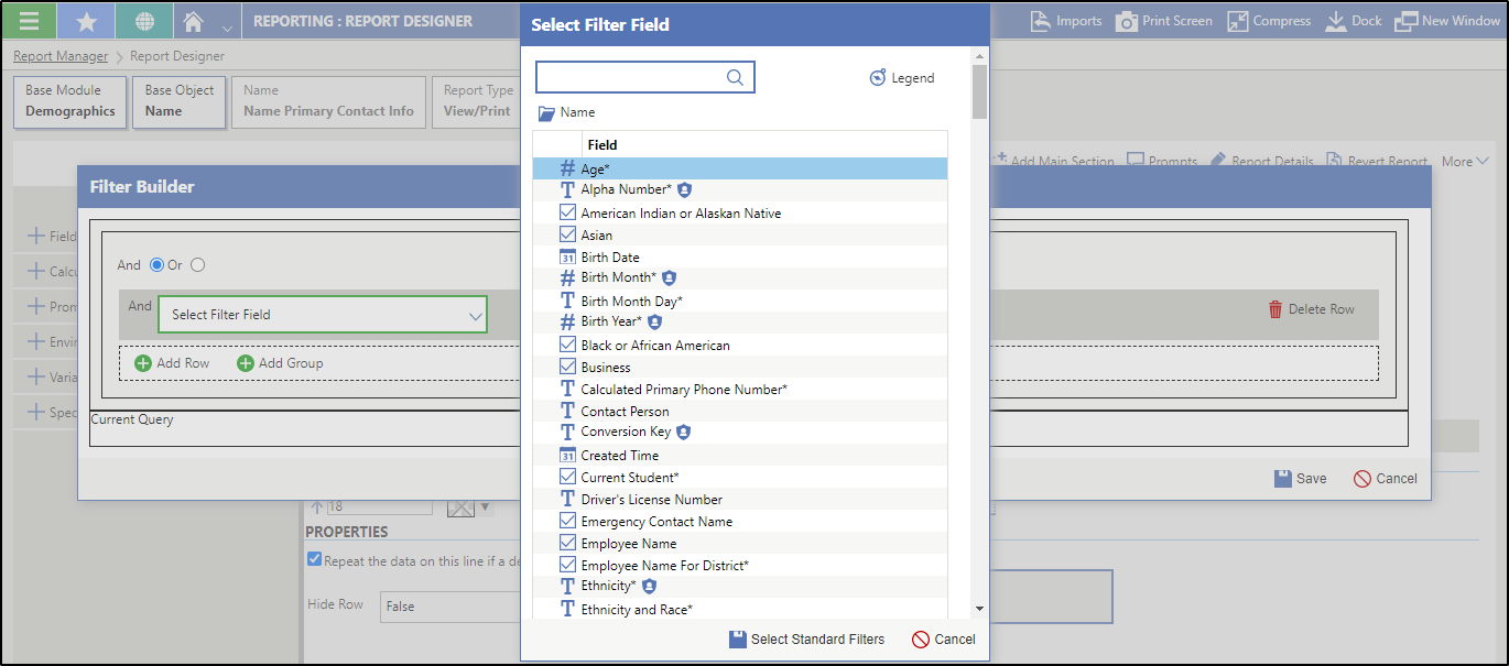 If the Field folder selected at the top of the Select Filter Field pop-up window has a standard filter associated with it, you see the Select Standard Filter option. Standard filters, such as name filters, are filters the system has set up. If the standard filter is selected, the system automatically builds prompts for the standard filter.