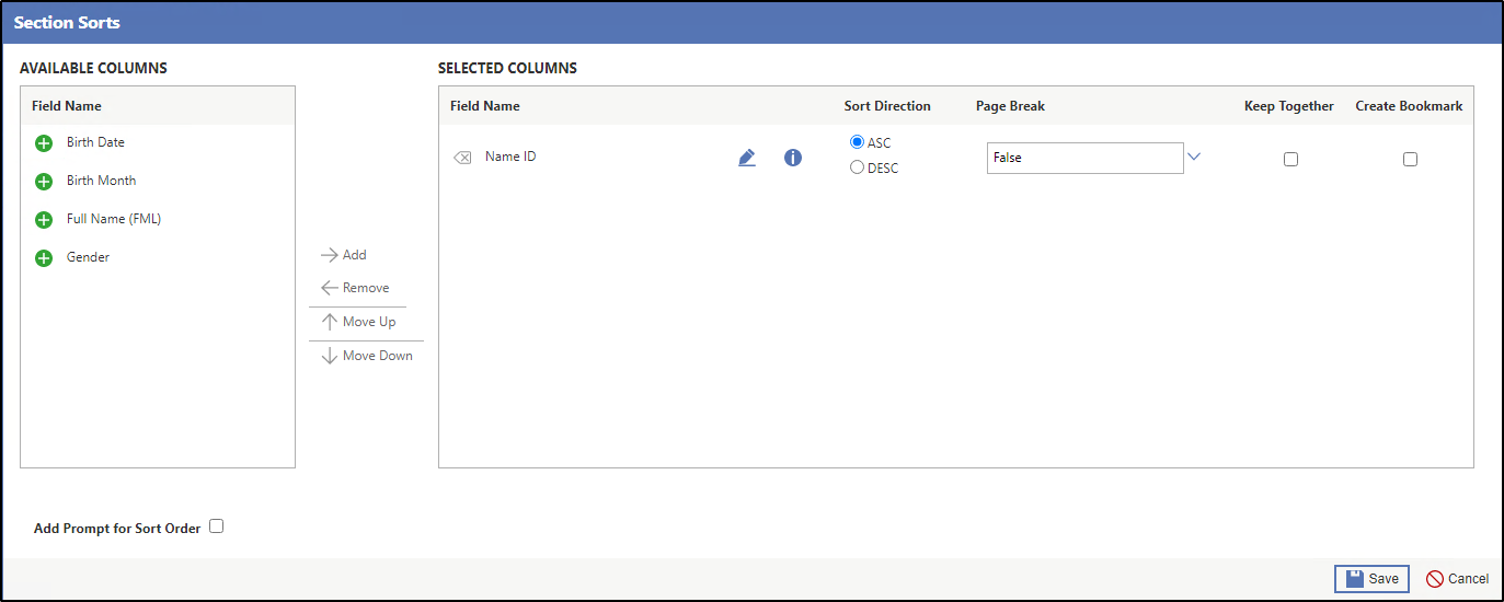 Sorting the data that appears on your reports makes it possible to organize the information in a way that is most useful to you. For example, if you run a report of users in your system and wish to have the list appear in alphabetical order, this configuration can be set in the Section Sorts area of the Report Designer. Additionally, you can change the order of the sort, such as sorting first by last name, and second by first name. You can also choose to page break on a field; for example, you can set up the report so there is a page break each time the building changes. You can set up the section sorts to create a prompt so the individual users can decide to page break when they run the report.