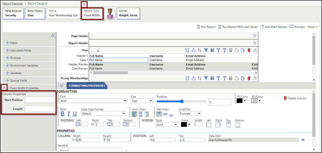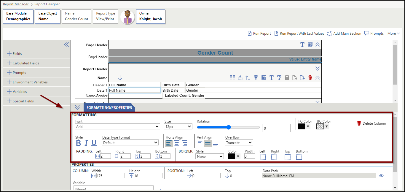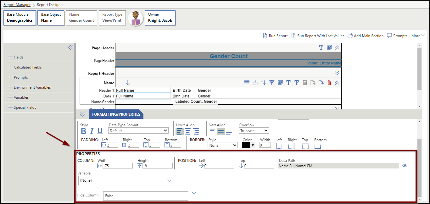 | Position: Left | The horizontal position of the selected field from the left edge of the report. | This field is measured in pixels. You can adjust the number here or move the field within its section of the Report Designer, which will automatically adjust the number. |