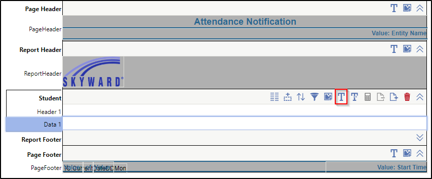 Hi! It's Jake from Skyward. Let's learn about Creating Text on a Report. We'll navigate within the Menu, locate the Reporting module, and select the Report Manager under Features. We'll locate our report that we wish to modify and access the design report screen. In our example, we're going to add a text to the Report Header for the title of the report. To do this, I need to expand my Report Header line, select Report Header, and then select the Text icon to insert my text field on the line where I wish. Since I want my text to center across the page, I need to modify the width of my field. I can then enter the Custom Text in the field at the bottom of the screen. This report is called the Student Activities List. Once I have my text entered, I can click anywhere on the screen and I will see that text show up in my field. In order to get that text centered, I'll have to update my Horizontal Alignment. Once my field is formatted the way I wish, I can save my changes. That's all there is to creating text on a report.