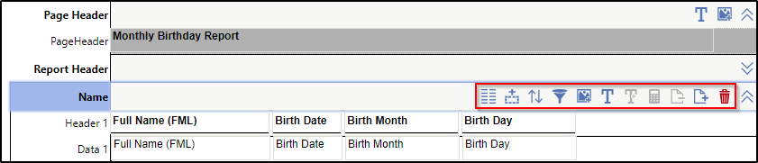 The image below displays the report designer options within the Name main section of the Monthly Birthday Report.
